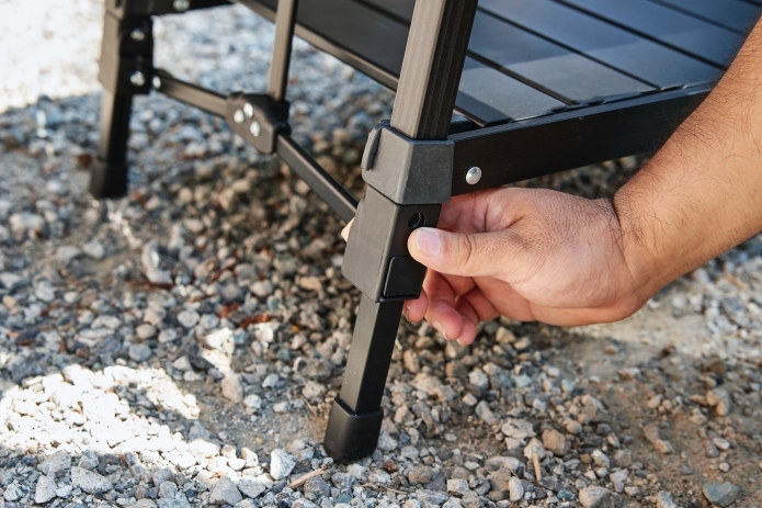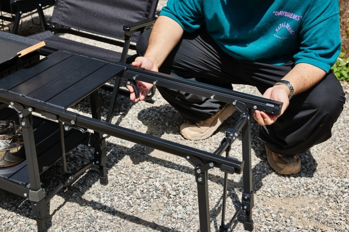 地面の凹凸や傾斜に対応できるのはもちろん、他のファニチャーと高さを合わせられるのも人気の理由のひとつ。グループキャンプでみんなのテーブルをつなげる時も重宝しそうです!