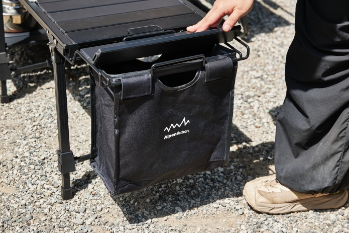 テーブルサイドに取り付けられる便利オプションは他にも。こちらの「撥水テーブルサイドストレージ」はテーブルのふちに引っ掛けるようにセットすることで、収納を追加できるアイテムです。