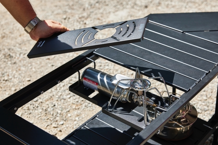 「アルミユニットテーブル」に付属の吊り下げ式ラックを取り付けることで、カセット式コンロをはじめとした、バーナーを組み込める点もこのテーブルの魅力です。