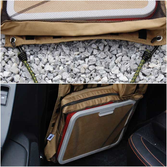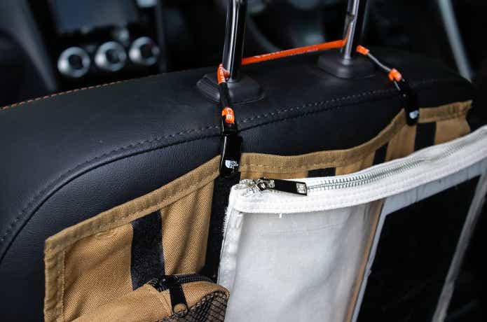 個人的にメインの用途に考えているのが、シートバックポケットです。クルマのシート背面に取り付ければ、小物収納に早変わり。