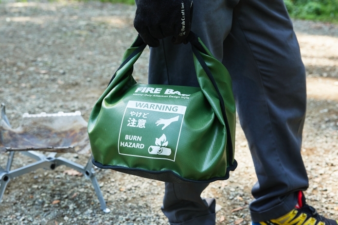 耐熱温度は700℃。完全に鎮火していない炭でも、袋に入れて口を二重に巻き、バックルを閉じて30分以上放置すれば、酸欠状態で完全に鎮火できます。