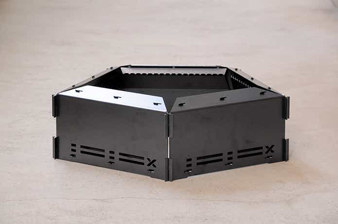 1ユニットが2枚の金属パーツで構成され、焚き火台に合わせて、4〜5ユニットを組み合わせて使います。
