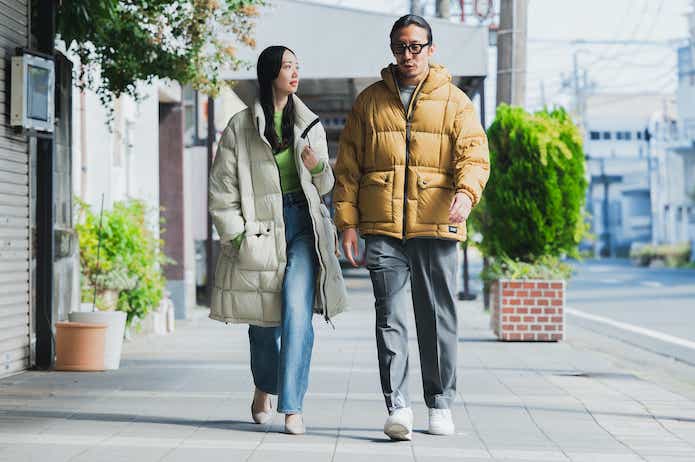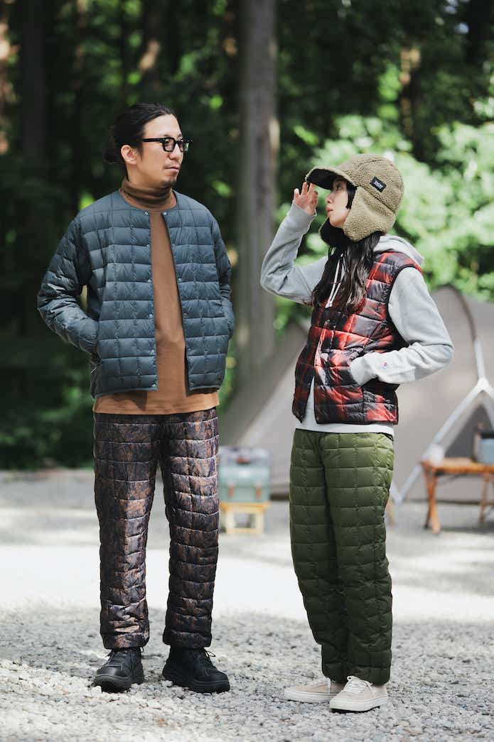 そんな高機能な素材を用いたダウンは秋から春まで活躍。温かいダウンというと、モコモコとした姿をイメージするかもしれませんが、TAIONのダウンはすっきりスマートな印象です。上下で着用しても野暮ったくならず、男女でのリンクコーデも楽しむことができます。