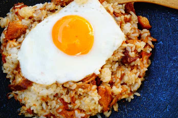 最後はこちら。公式レシピでは「炊き込みごはん」なのですが、ここでは筆者の独断でキャンプでもっと簡単に作れる「混ぜごはん+目玉焼きのせ」にアレンジしたものをご紹介します。