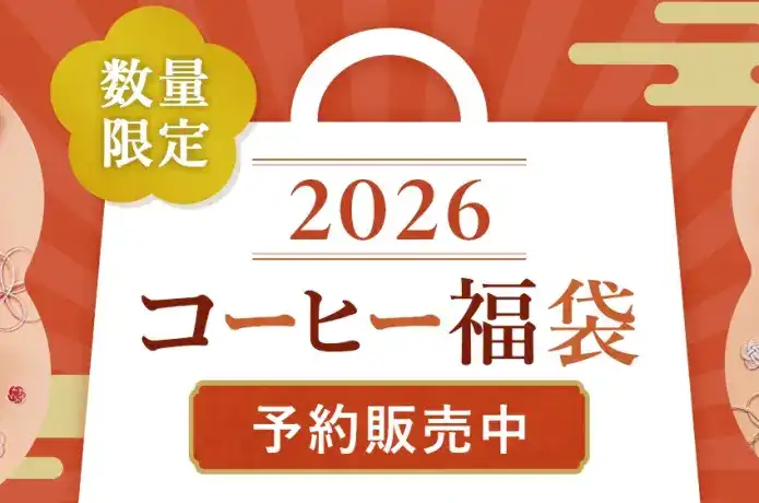 「コーヒー福袋2026 オリジナルバッグ入りブランケット&マグカップ付き」は、粉・豆・ワンドリップの3タイプ。豆と粉タイプはすでに完売と、その人気ぶりがうかがえます。