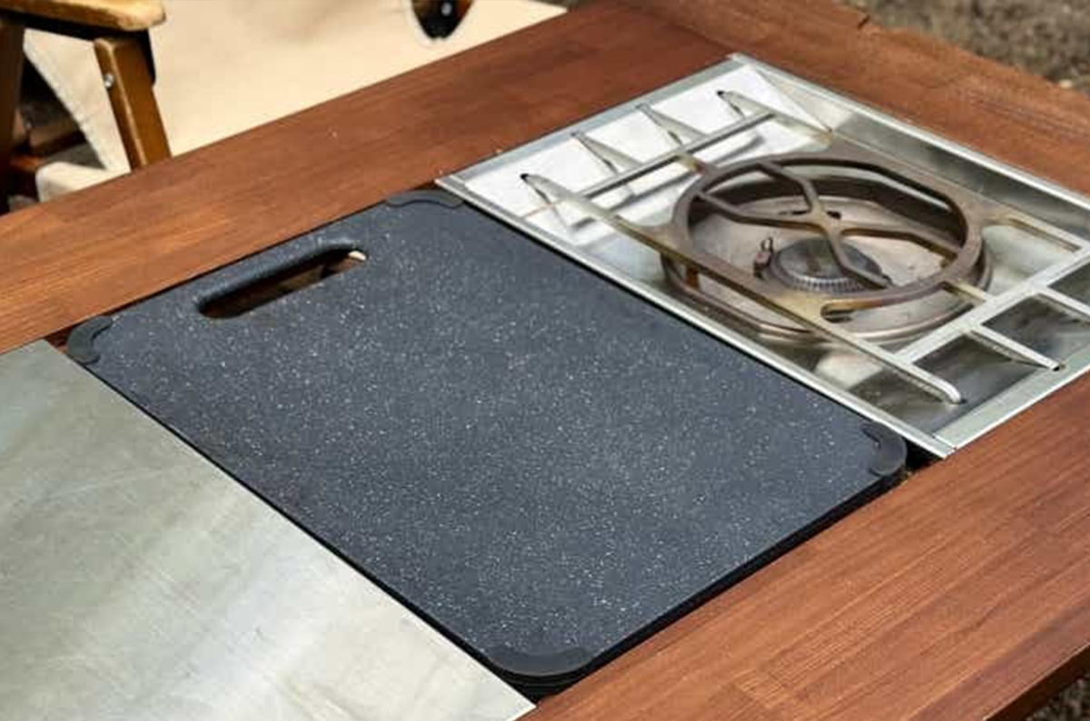 スノーピークのユニット式のテーブル「IGT(アイアングリルテーブル)」の略称。フレームに組み換え式の天板が付いていて、別売りのバーナーやラックをインストールして機能を拡張できる。