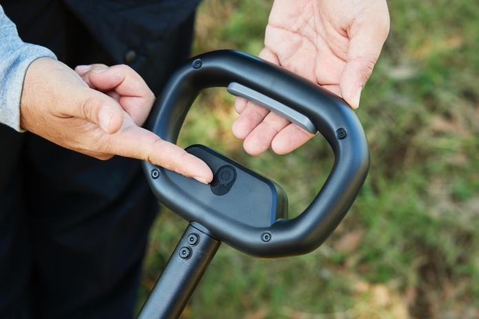 ワゴンの操作はいたってかんたん。あるのは電源ボタンと、グリップのトリガー式スイッチのみです。この操作のシンプルさの秘密は、「イーワゴンエアー」ならではの電子制御システムにありました。