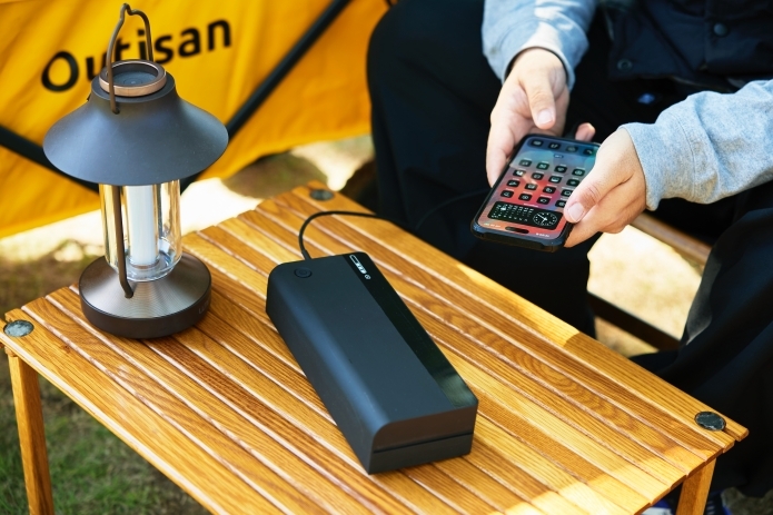 取り外し可能なバッテリーは、USBの出力ポートがついているので、スマホやLEDランタンなどの電子機器への給電もできます。iPhone であれば、約10回分のフル充電が可能。