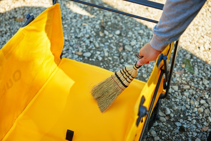 ワゴンカートを使用していると、中に砕けた枯葉や砂などが溜まりがちですが、後ろが開くと手ぼうきなどでさっと払えます。