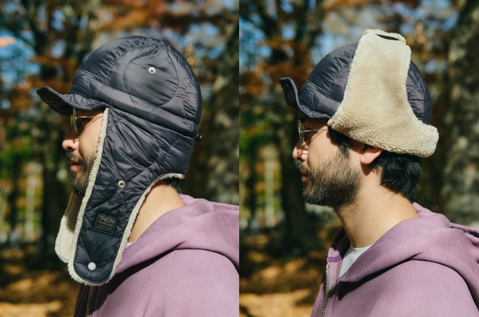 キャップはダウンとボアを組み合わせたデザインで、ドッグイヤーパーツは上で固定できる2WAY仕様。