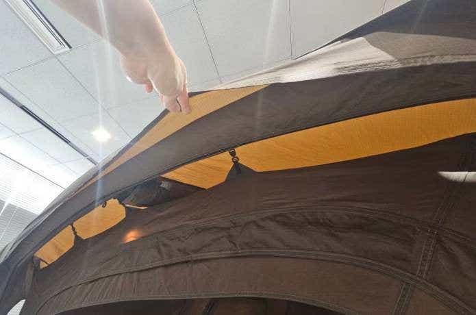 見た目のインパクトだけでなく、ファスナーで取り付けるタープは前だけでなく左右にも広がり、広いリビングスペースを確保できるうえ雨や風からもしっかりガードしてくれるなど、機能面も充実しています。