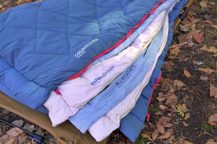「マルチレイヤースリーピングバッグ」はファミリーキャンプにもおすすめ。春秋の心地よいシーズンであれば、1つの寝袋を2人で分けて使うことも可能です。