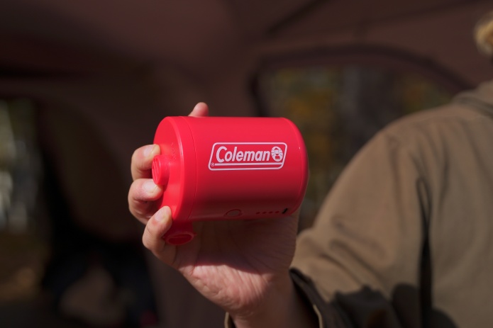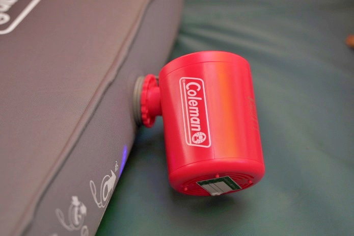 マットの収納ケースを簡易ポンプとして使うこともできますが、さらに便利なのが電動の「モバイルポンプ」です。