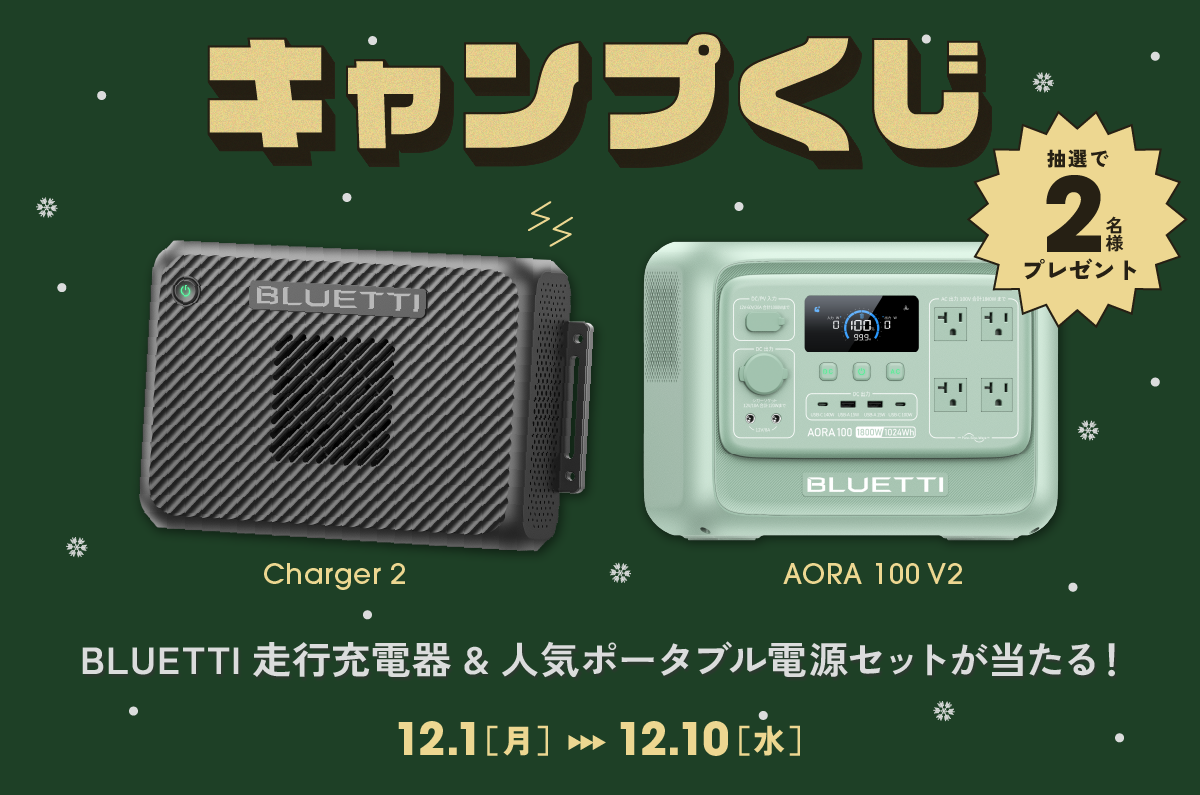 今回の賞品は、BLUETTI最新の走行充電器「Charger 2」と、ポータブル電源「AORA 100 V2」の豪華2点セットです。