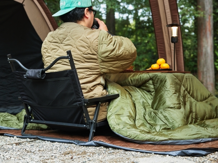 地面から座面までの高さが11cmに設計された低めのローチェアで、一番低い状態で設営した「こたつユニット」にもぴったり。