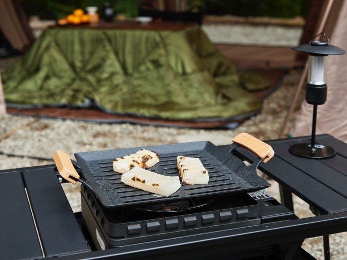 脂や水分が落ちないものを焼くなら、市販のカセットコンロとの組み合わせも有効です。冬は餅を焼くときに便利!