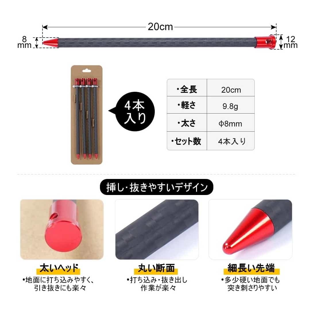 軽量かつ丈夫なカーボンファイバー製のペグは、存在こそするものの、高価であったり、そこまで軽くなかったりと、なかなかニッチなジャンルでした。