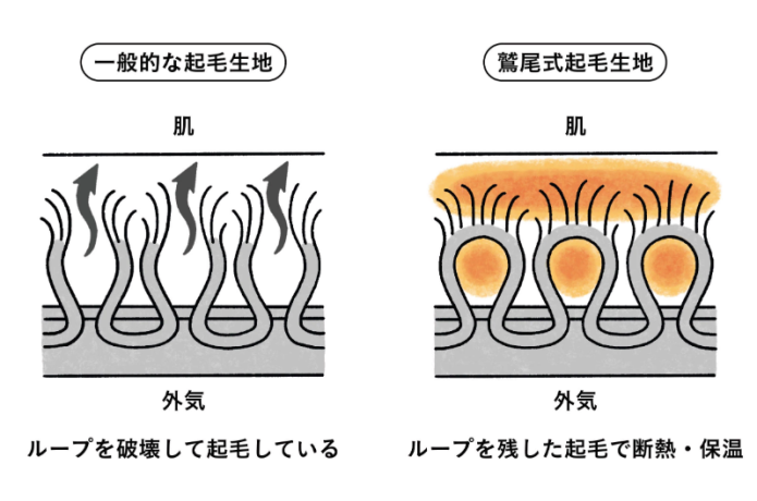 イエティナの暖かさの秘密は、門外不出の特許技術「鷲尾式起毛」。パイルのループをカットせずに起毛を施すことで、パイル層と起毛層の“ダブルの空気層”を確保。これにより、優れた保温性と断熱性を実現しています。