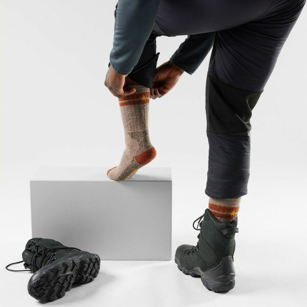 抜群のフィット感はそのままに、厚手の生地を採用した「ヘビーエクスペディションブーツ」。太めのメリノウールを使うことで、暖かさと耐久性をしっかり高めています。裏面にはパイル編みを施し、保温性とクッション性もさらに向上。登山はもちろん普段使いにも最適です。