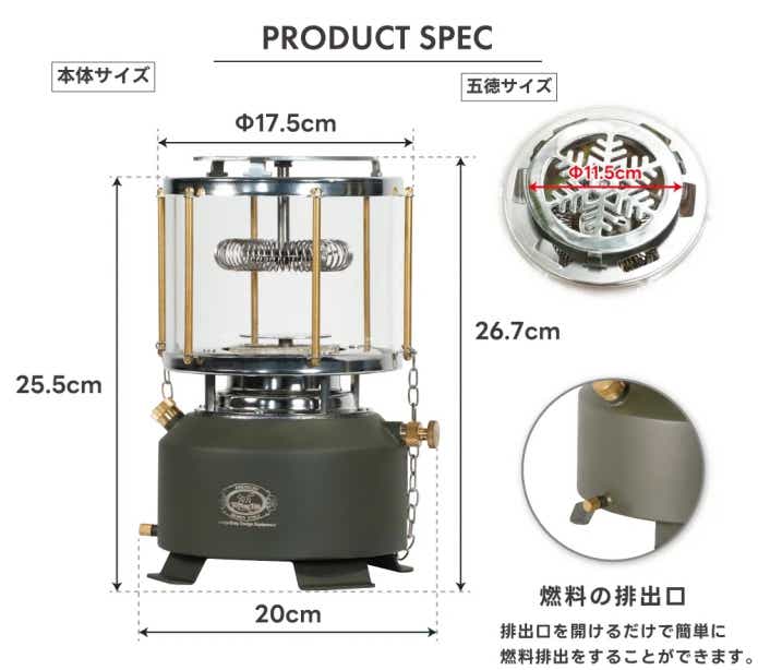 燃料はパラフィンオイルと灯油のどちらにも対応。基本は煤(すす)が少ないパラフィンオイル推奨ですが、手に入りやすい灯油も使えることで、非常時の備えとしても使える1台です。