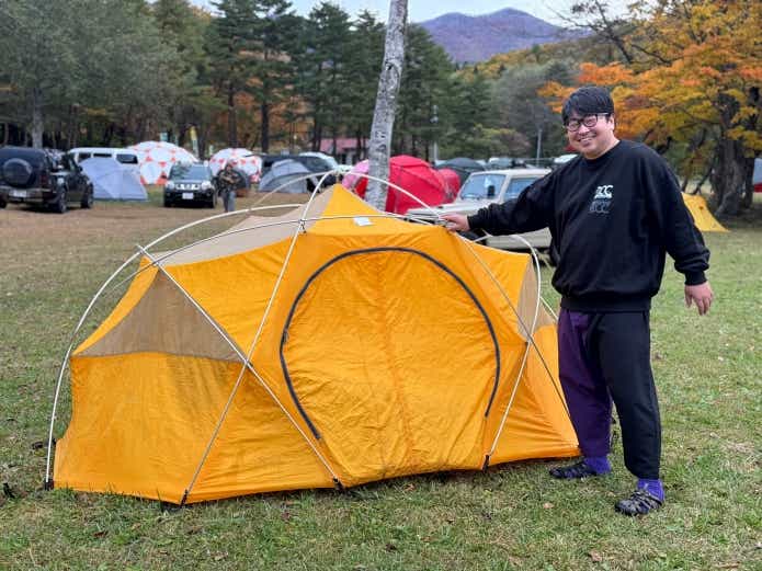 そのテントについて解説してくれたのは、このイベントを主催する、大のドームテントマニア、KUMAさん( @kuma560_kuma560)。多数のレアなドームテントを所持し、仲間たちの珍しいテントも数多く見てきたこともあり、深い造詣を持ちます。