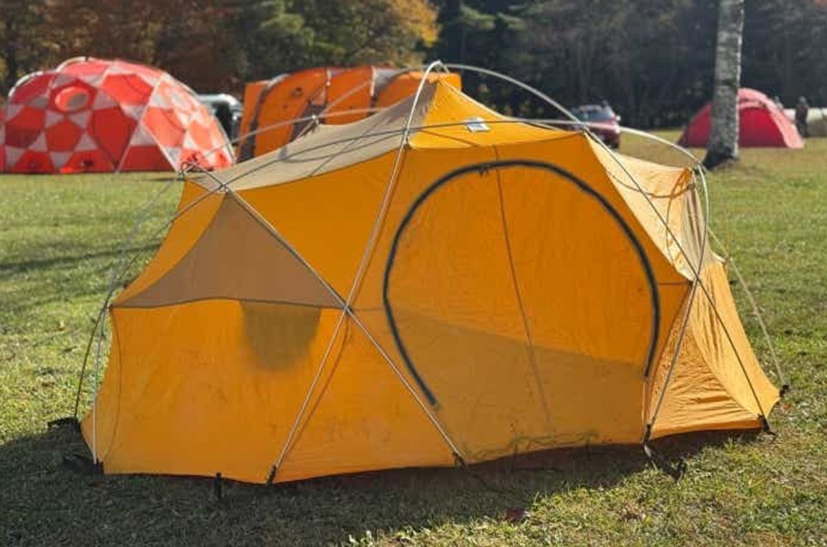 張るだけで、ギア好きの会話がはじまりそうな一張り。「実はこれ、世界初のドームテントなんですよ」そんな一言が似合う、唯一無二の存在でした!