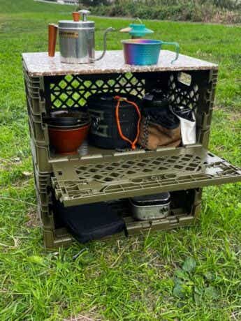 キャンプ用のコンテナは各社から出ていますが、「これだ」と思えるものがなかなか見つかりませんでした。FLIP BOXは収納力も抜群で実用的、そのまま棚として活用できるのも利点で、何よりオシャレ