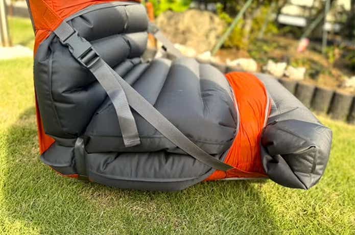 使い方も至ってシンプル。エアマットの下部を2つ折りにして、「トレッカーチェア」に挿し込み、バックルを留めるだけです。