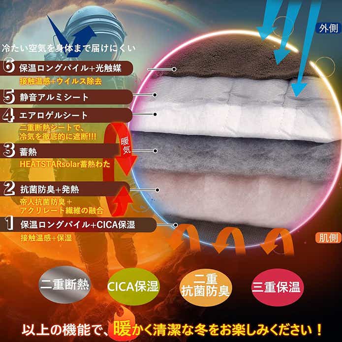 しかも、エアロゲルシートだけでなく、静音アルミシート、熱を吸収して体を温めるアクリレートわた、炭化繊維など計6層にも及ぶ徹底した断熱構造。