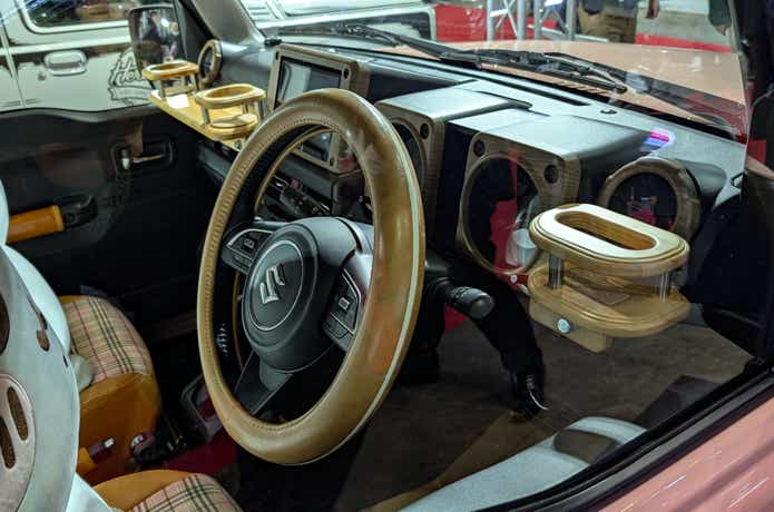 内装は「ノスタルジーシートカバー チャッカーズ」やウッドのドリンクホルダー、本革調ステアリングカバーなどでトータルコーディネートされています。