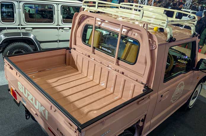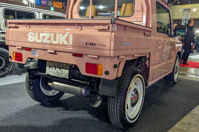 貨物車の場合、法律で最大積載量をリアに表示する義務があります。 つまり、この“ジムニートラック”に最大積載量が表示されているのは、公道走行を見据えた「正しき証」と言えるでしょう。