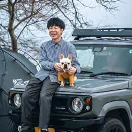 愛車ジムニーに装着したカーサイドオーニングを広げ、その下に椅子やテーブルを並べて過ごすのが主流というライターのマツさん。