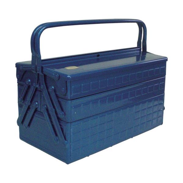 プロツールアイテムを専門に取り扱う「トラスコ」の3段式工具箱は、スチール製の頑丈な作り。本体の角にすべて丸みを持たせた安全な設計で、左右に開閉できます。