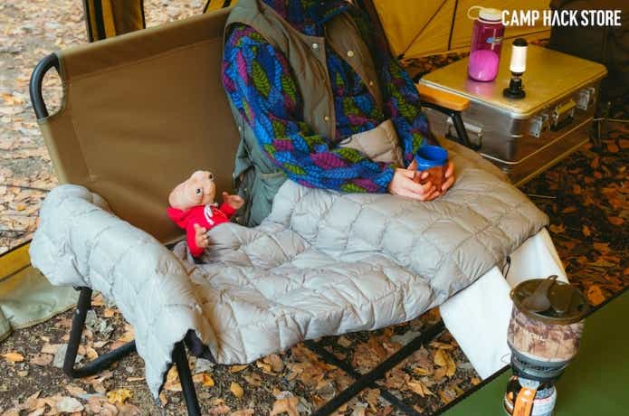 次に紹介するのは、インナーダウンブランドTAIONの「ワイドダウンブランケット」。コットと組み合わせて使えるようにという、CAMP HACK STOREオーダーのコラボアイテムです。