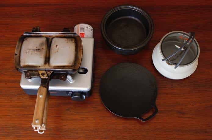 イザまるに使用できるクッカーは、鍋底20cm以下とのこと。試しにいろいろな調理器具をのせてみると……