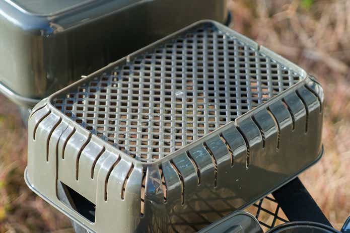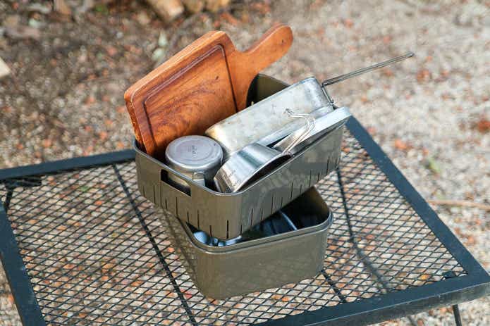 Lの方をバスケットにしてもよさそうです。外箱に汚れた食器を放り込み、洗ったら網かごに入れておく、と。これなら本製品2サイズをスタックして持って行くメソッドも使えます。