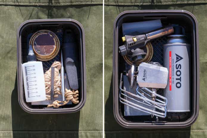 まずは炎関係。Mサイズには火熾しギアやアルスト類が気持ちよく入りました。モーラナイフのエルドリスも入っています。Lサイズの方は、Mの内容物に加えてCB缶とシングルバーナーも。