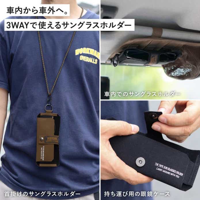 サングラスも収納したい場合は別売りの「テープサングラスホルダー」を併用するのがおすすめ。面ファスナーでカーバイザー オーガナイザーに取り付けができ、車から離れるときは首掛けでそのまま屋外に持ち出すことができます。
