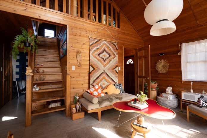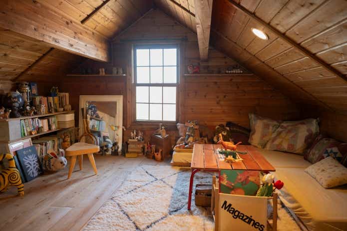 今回訪れたお住まいにも、アウトドア感を押し出した演出はありません。クラシックな雰囲気漂うログハウスの空間には、北欧の家具や日本各地で集めた民芸品がセンス良く置かれていました。