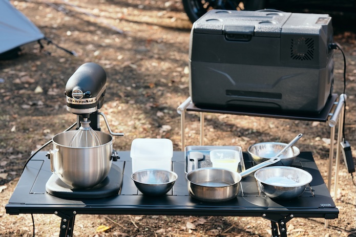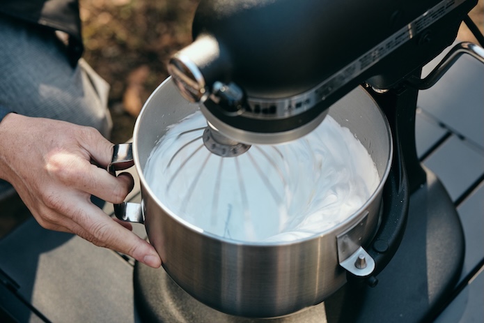 早速、「新型RAV4 PHEV」から得た電力を活かし、業務用のスタンドミキサーを使用。いきなりキャンプとは思えない、本格的なマシュマロ作りを展開する三上シェフ。