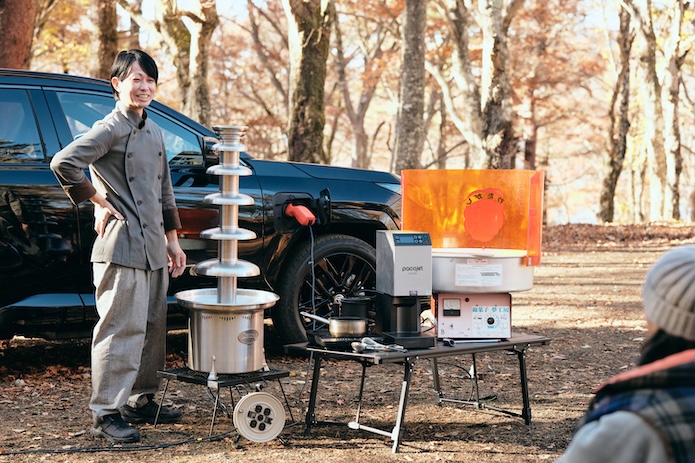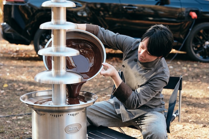 そういいながら、今度は「新型RAV4 PHEV」に巨大なファウンテンマシンを繋ぎ、溶かしたチョコレートを流し始めました。これは、もしやパーティ会場などで見かけるやつ? ちなみにこのチョコレートファウンテンマシンの消費電力は約1,000Wもありました。