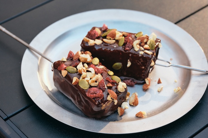 さらに、ナッツやドライフルーツなどのトッピングもプラスして完成! 至高のキャンプスイーツに仕上がりました。