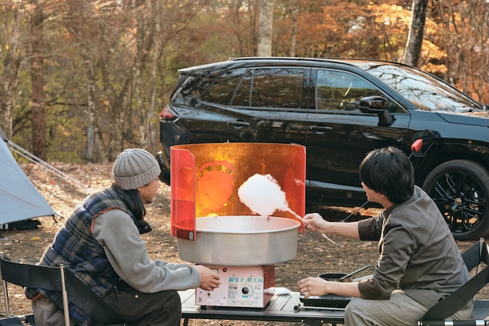 続いて三上シェフが「新型RAV4 PHEV」に繋いだのは、お祭りの屋台で見かける「わたあめ機」。そして、焼きマシュマロにわたあめを巻き付けていきます。わたあめ機の消費電力は1,120Wと、意外と高い!