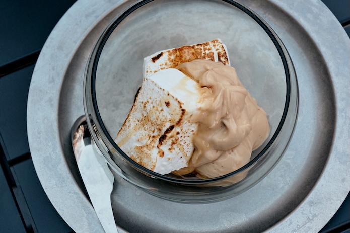 猪野さんが焼き上げたアツアツの焼きマシュマロと合わせ、焼きマシュマロアイスの完成!