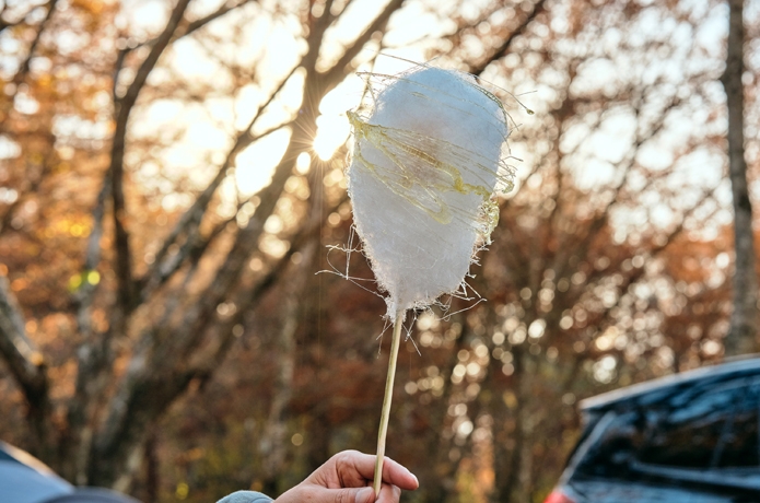 その水あめを薄く伸ばしたのちに、わたあめに巻き付け、芸術的なキャンプスイーツが完成! 三上シェフが、いよいよ本気を出してきたかも?