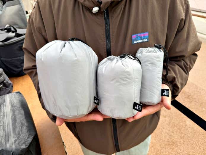 中綿入りの軽量スタッフサック「パファースタッフサック」。S、M、Lの3サイズ展開。4月上旬発売予定
