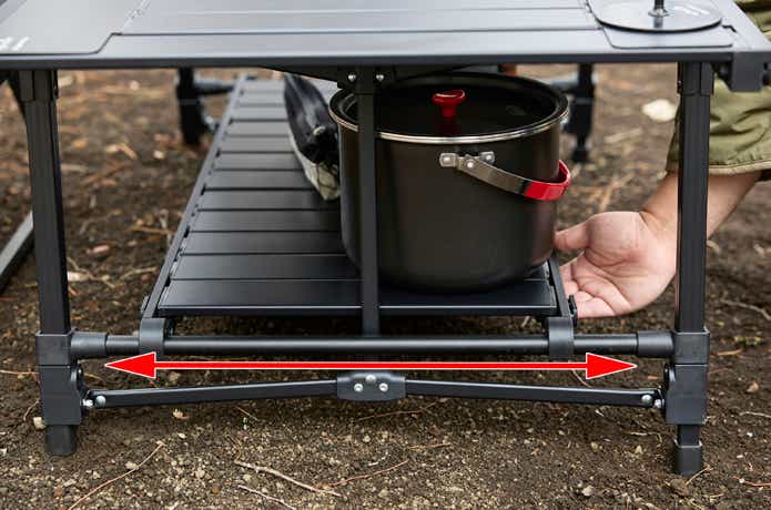ちなみに設置した下段ラックは、前後に約6cmほどスライドできるようになっています。ソロで使うときは片側にラックを寄せて足を入れるスペースを確保するといった使い方も可能。