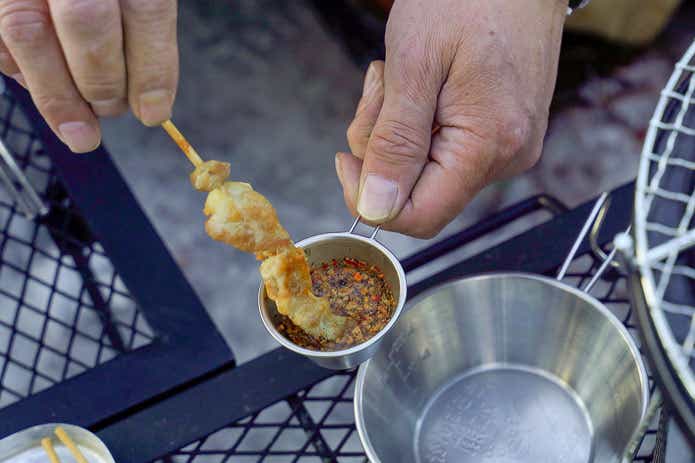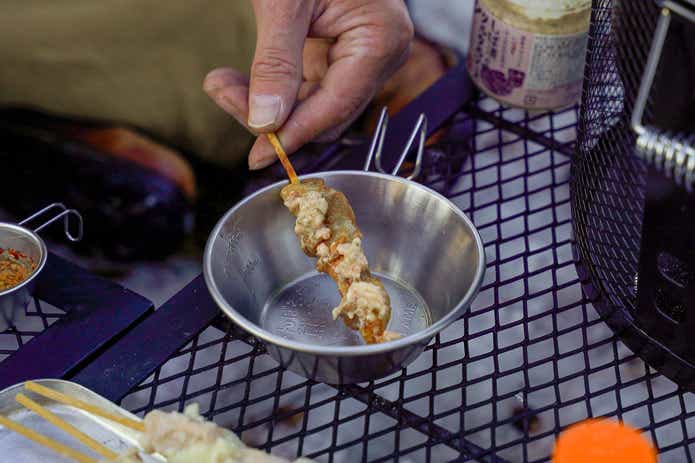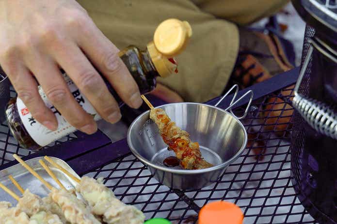 焼き鳥にとぷとぷと流しかけて食べてみたところ、ほどよい甘さと塩味で安心感のあるうまさでした。隠し味に味噌を使っているそうで、豊かなコクも感じられます。