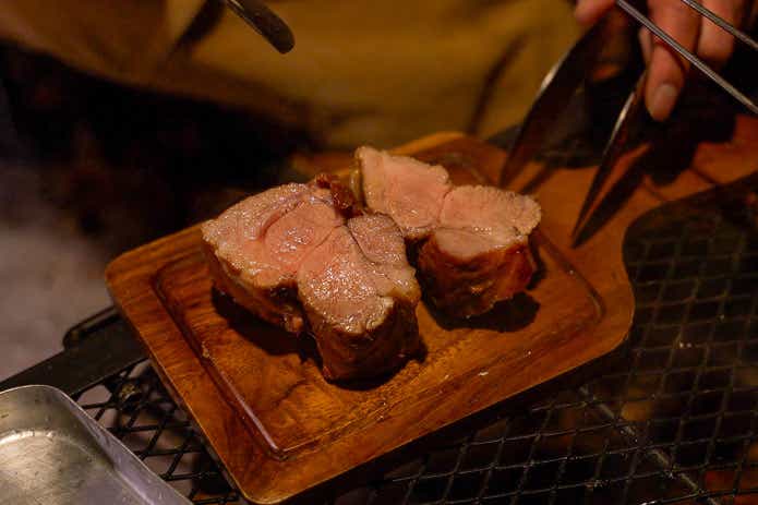 湯煎を開始してから1時間が経ちました。肉を取り出して切ってみたところ、中央部分がまだほんのちょっと赤いかな……といったところ。もうちょっとかかりそうですね。
