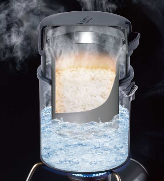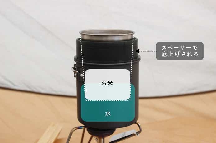 このスペーサーの存在が、一般的なクッカーとの大きな違い。お米の入ったクッカーには直接火が当たらないので、焦げつかないというわけです。